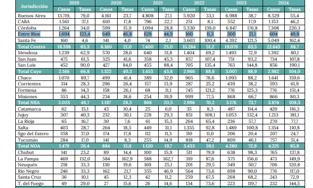 “La tasa nacional de notificación pasó de 56,1 casos cada 100.000 habitantes en 2019 a 93 en 2024, lo que representa un incremento del 65,8% en ese período. Luego del descenso registrado en 2020 (23,3) y 2021 (26,5), en 2022 se observó una reversión de la tendencia con un incremento de la tasa a 57,6, superior a los valores previos a la pandemia. Esta tendencia se acentuó en los años subsiguientes, con una tasa de 69,2 en 2023 y 93 en 2024, el valor más alto del período”, señala el Boletín.